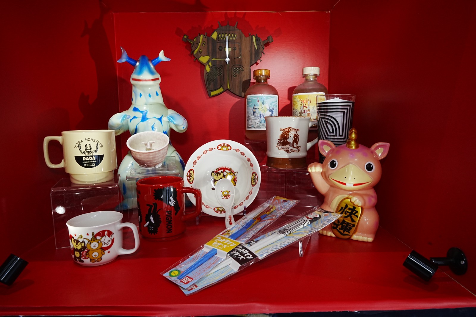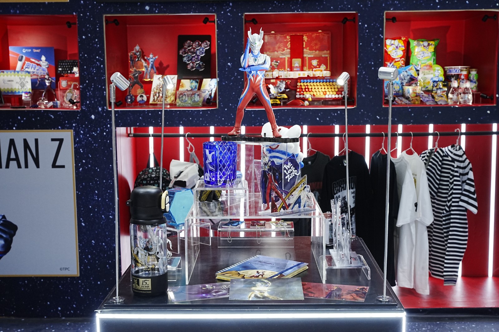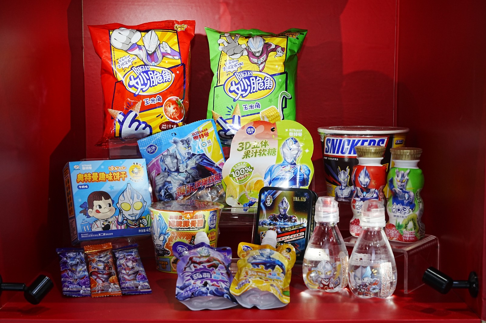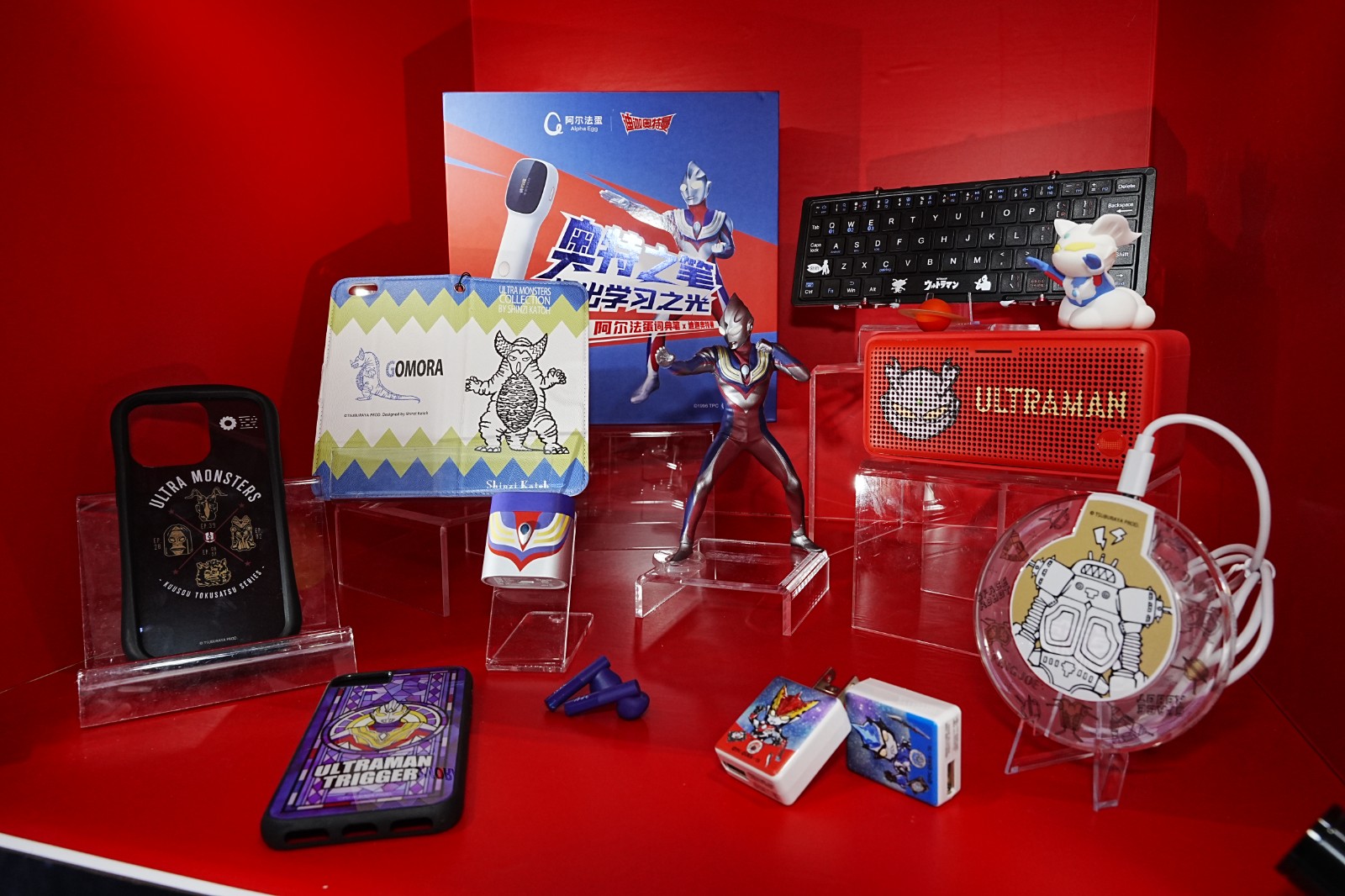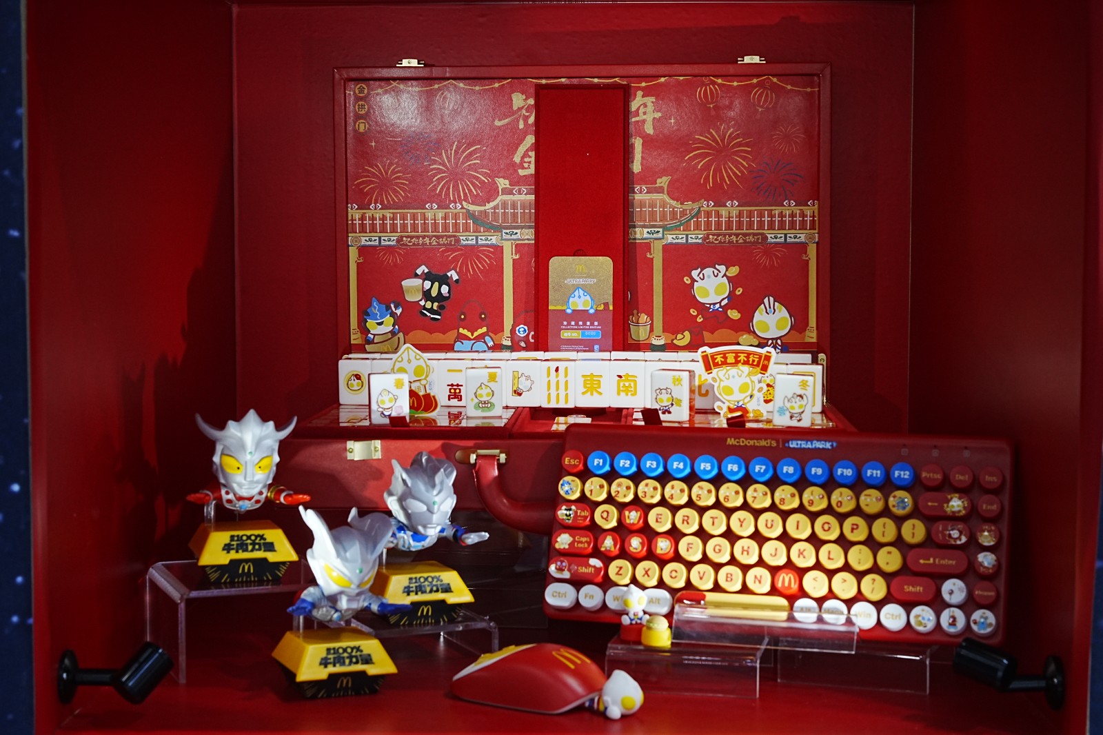 展区多个展柜陈列经典授权好物:“展望奥特曼 60 周年主题展”的相关周边;不二家、奇多等品牌联名零食;联名耳机、音响键盘等 3C 产品;怪兽系列餐具、酒类、服饰与潮玩;还有麦当劳联名新春麻将、键鼠,以及赛罗奥特曼 15 周年纪念周边……
