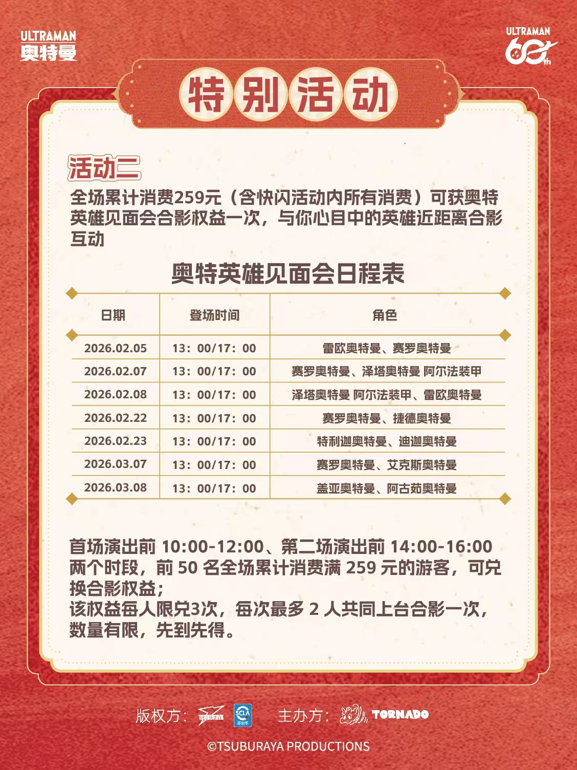 奥特英雄见面会当天,消费满 259 R M B即可与奥特英雄合影!每轮仅限 50 人,先到先得哦~